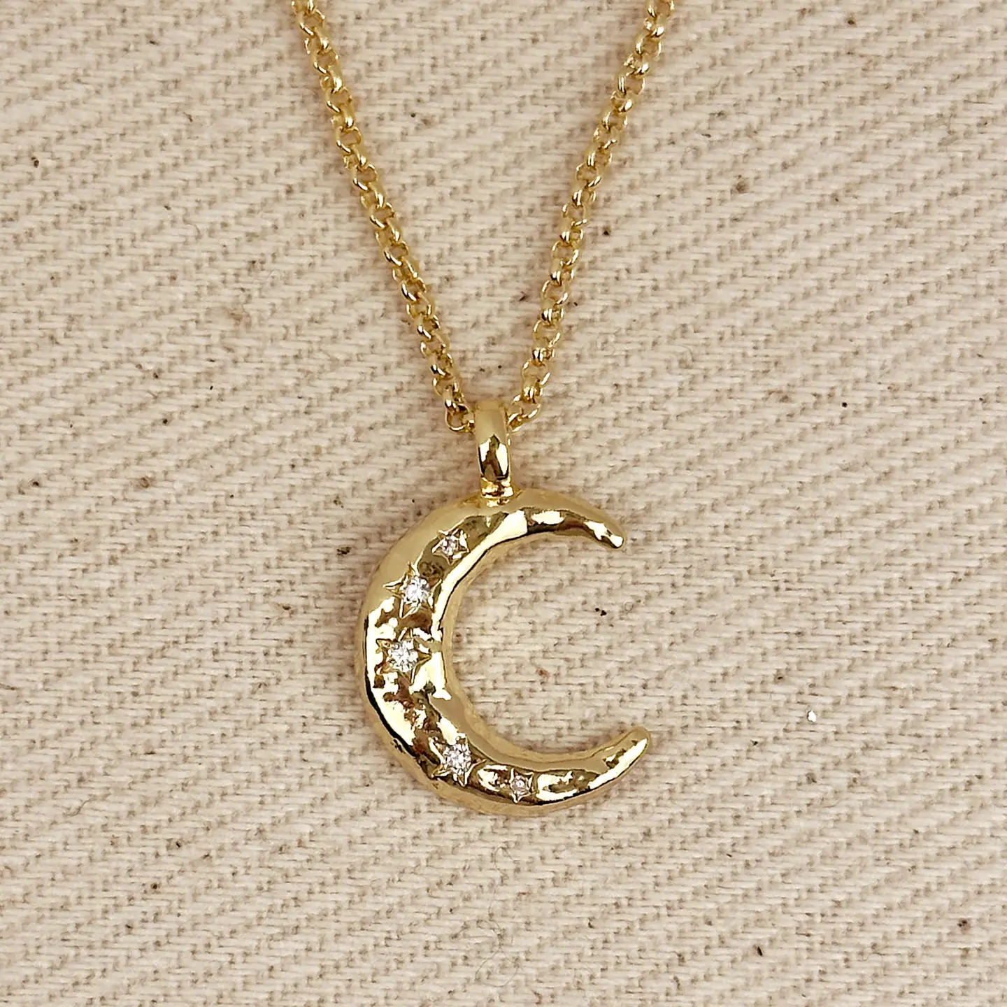 18K Gold Filled Hammered Crescent Moon and CZ Necklace